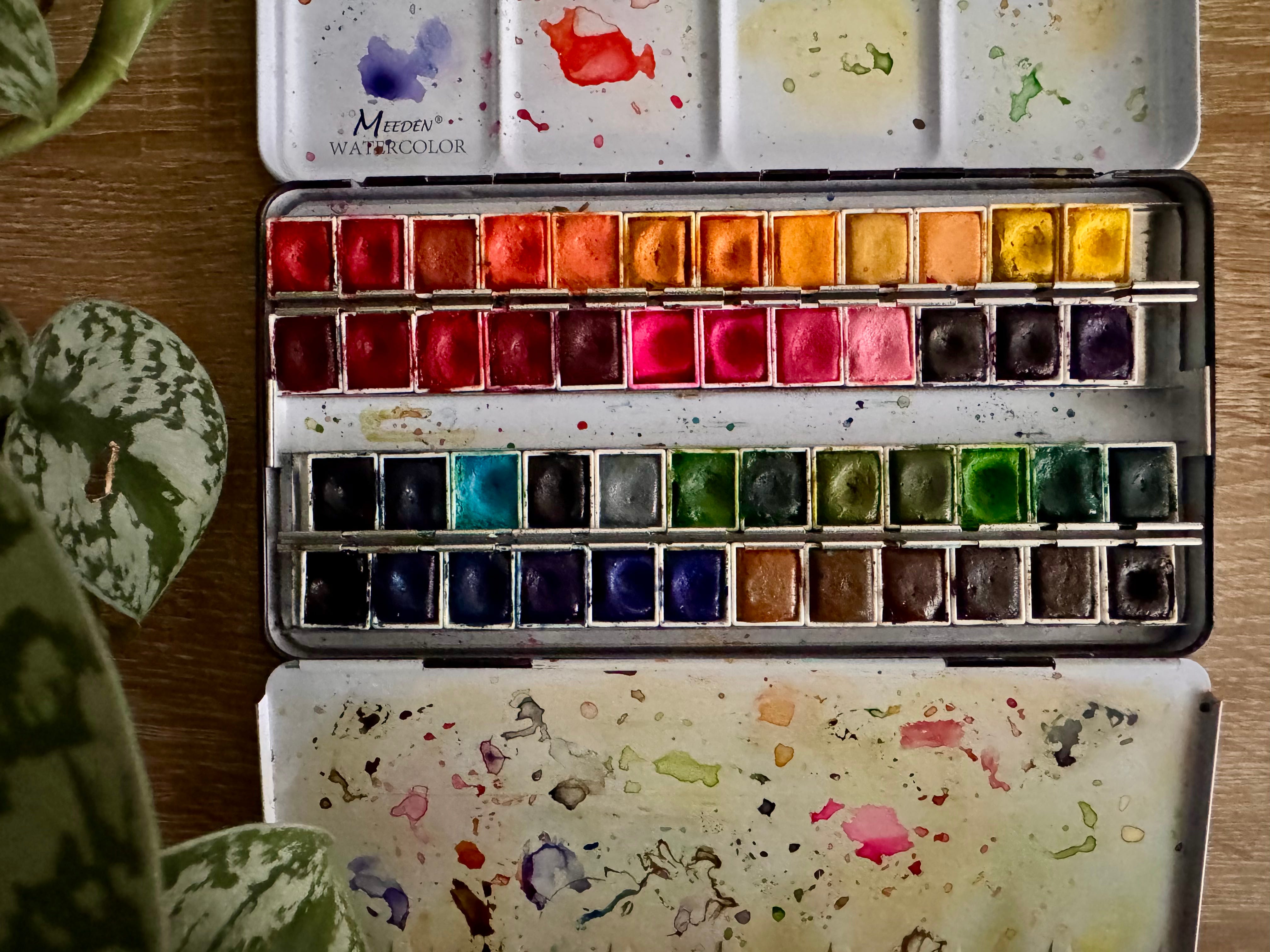Watercolor is my go to paint of choice. My kit is a mixture of pan paints from a few collections I put in a bigger paint tin.